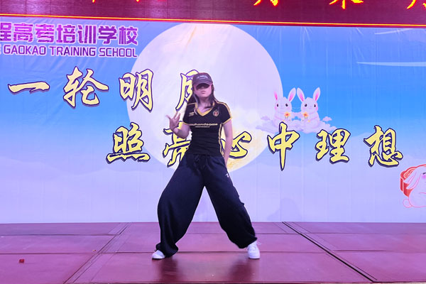 2502班赵*同学带来活力四射的啦啦操,青春的节拍与天上的明月遥相呼应,让现场氛围持续升温。